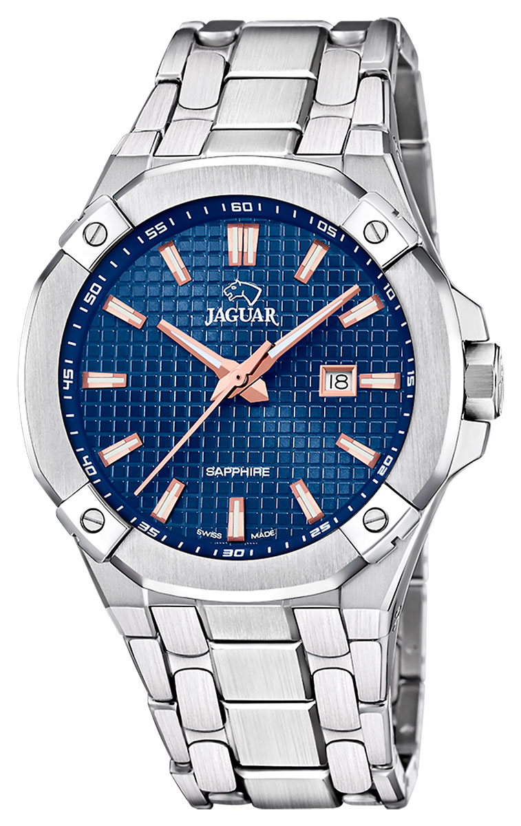 Jaguar Diplomatic J1009/2 med sitt RONDA 705 urverk visar den exakta tiden där du befinner dig. Urtavlan på denna Schweitziska klockan är prydd med tapisserie guilloche vilket skapar en fin kontrast mot de rosegyllene markeringarna. Safirglaset har ett antireflektiv behandling, och datumvisning sitter vid klockan tre. Bredd på boetten är 44 mm, och tjockleken är 11.5 mm. Jaguar Diplomatic J1009/2 är tillverkat helt i 316L kirurgisk stål, och tål vatten ned till 100m / 10atm vilket innebär att klockan går att bada eller simma med.