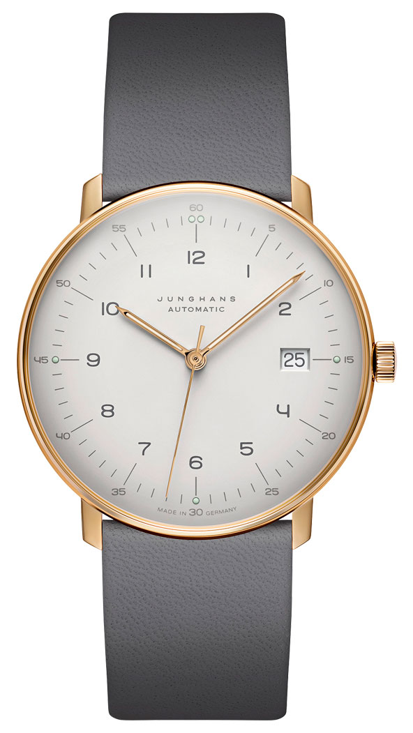 Unisexklockan Junghans Max Bill Automatic 27/7806.02 har en elegant och minimalistisk urtavla, inklusive rep- och reflexfritt safirglas, en dagsklocka vid klockan 3 och självlysande minut- och timvisare för enkel avläsning i mörkret. Det automatiska urverket med kaliber J800.1 har en effektreserv på 38 watt. Boetten i PVD-belagt guldfärgat rostfritt stål mäter 38 mm i bredd och 10 mm i tjocklek. Det grå läderarmbandet är av äkta läder och har en bredd på 20 mm vid fästpunkten. Junghans Max Bill Automatic 27/7806.02 har en vattentålighetsklass på 50m/5atm, vilket innebär att den har begränsad vattentålighet (simning rekommenderas inte).
