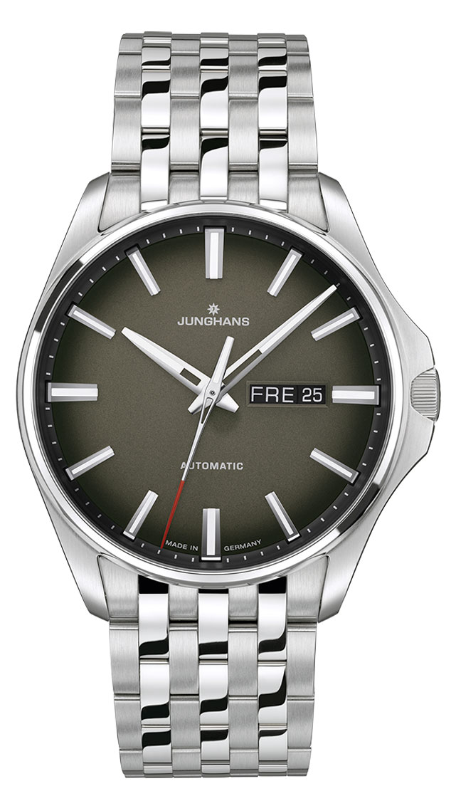 Junghans Meister S Automatic 27/4210.44 är ett funktionellt armbandsur som följer med dig till arbete, fritid och sport. Klockan är utrustad med ett automatiskt urverk av kaliber J800.4 med 38 timmars gångreserv. Boetten är tillverkad i rostfritt stål med en bredd på 40,5 mm och en tjocklek på 13 mm. Slitstarkt safirglas med antireflexbehandling skyddar den kupolformade, olivgröna urtavlan med datum- och veckodagsvisning (veckodag på tyska eller engelska) samt självlysande visare och index. Armbandet i rostfritt stål har en bredd på 22 mm vid fästpunkten. Junghans Meister S Automatic 27/4210.44 har en vattentålighetsklass på 200m/20atm, vilket gör den lämplig för simning och dykning.