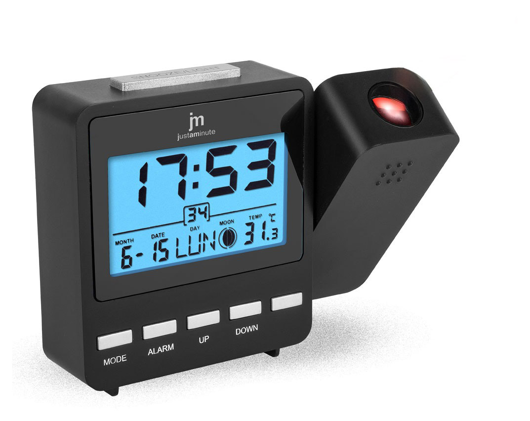 Fyrkantig Justaminute digital projektor väckarklocka JD9710 visar tid på vägg eller i tak. Klockan har alarm, backgrundsljus, kalender, månfaser, termometer och snooze. Språk: engelska, italienska, tyska, franska, spanska, nederländska, och danska. Mått:10,5 x 7,8 x 2,5 cm. Klockan fungerar med två AAA batteri (OBS! Batterier ingår ej i priset). Justamite alarmklockor har 1 års garanti.