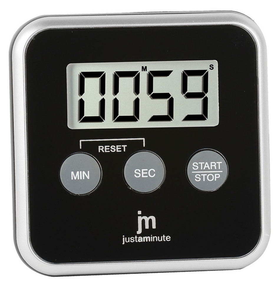 Fyrkantig Justaminute timer JT5412N. Tidtagarur har tidtagning, alarm, och en digital skärm. Mått:8 x 8 x 1,5 cm. Timer fungerar med ett AAA batteriet (OBS! Batterier ingår ej i priset). Justamite tidtagarur har 1 års garanti.