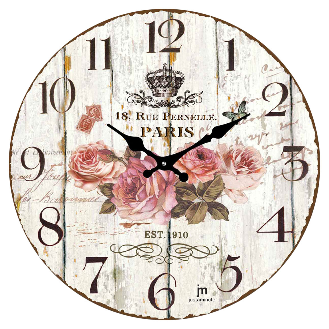 Justaminute 14862 är en väggklocka i vintage stil med arabiska tidsmarkörer och texten "18 RUE PERNELLE, PARIS, EST. 1910". Boettens bredd är 33 mm. Klockan fungerar med ett AA-batteri (OBS! Batterier ingår ej i priset). Justamite väggklockor har 1 års garanti.