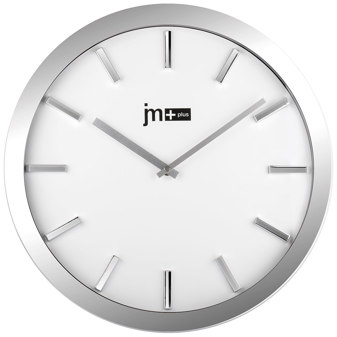 Justaminute 14952C vit väggklocka i metall med en silvrig ram och tydliga romerska timmarkörer. Diameter 40,5 cm. Klockan fungerar med ett AA-batteri (OBS! Batterier ingår ej i priset). Justamite väggur har 1 års garanti.