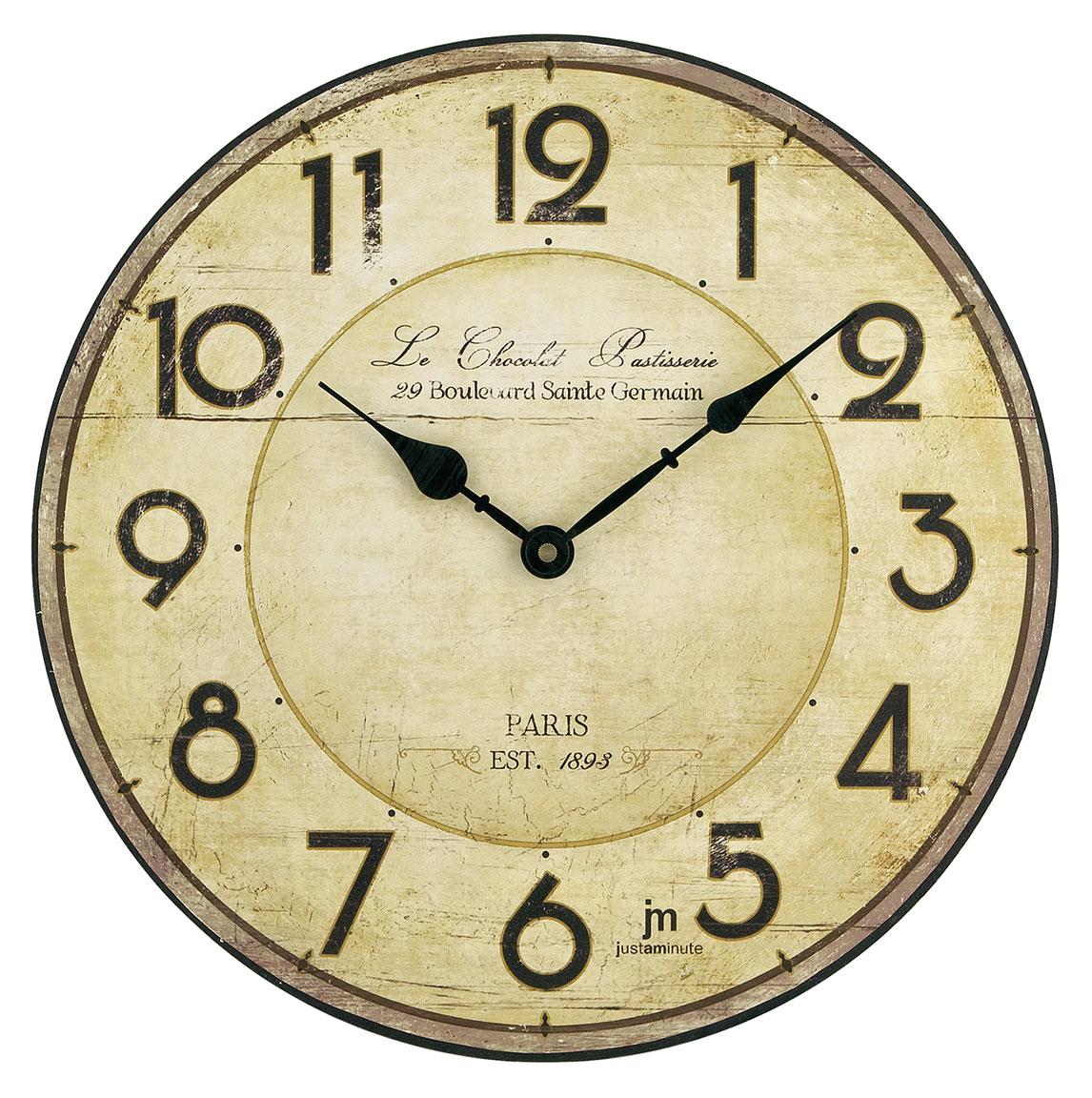 Justaminute väggklocka 21415 för rustik inredning med tydliga arabiska siffror och flytande sekundvisare. Diameter 33,5 cm. Klockan fungerar med ett AA batteri (OBS! Batterier ingår ej i priset). Justamite väggur har 1 års garanti.