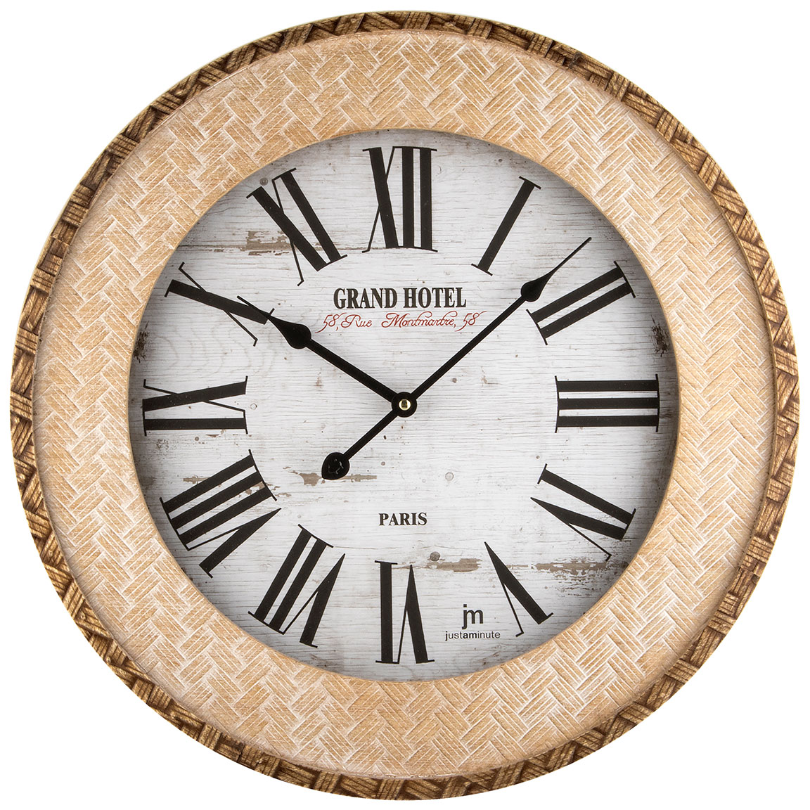 Justaminute 21518 är en stor vintage inspirerad väggklocka i rustik stil med romersk tidsmarkörer. Boettens bredd är 50 mm. Klockan fungerar med ett AA-batteri (OBS! Batterier ingår ej i priset). Justamite väggur har 1 års garanti.