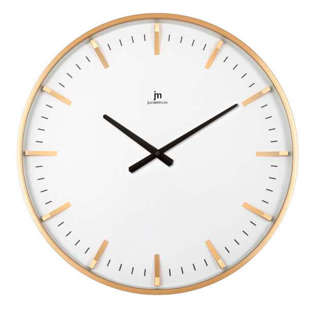 Väggklockan Justaminute 21542B betonar en modern minimalistisk design. Väggklockan har guldfärgade streckindex och svarta minut- och timvisare, som sticker ut mot den ljusa urtavlan. Ramen på klockan är gjord av metall. Väggklockan är lämplig som en utmärkt tidsindikator på väggen i ditt hem eller på din arbetsplats. Diameter: 50 cm. Klockan drivs på ett AA-batteri (batteri ingår ej). Justaminute-klockor har ett års garanti.