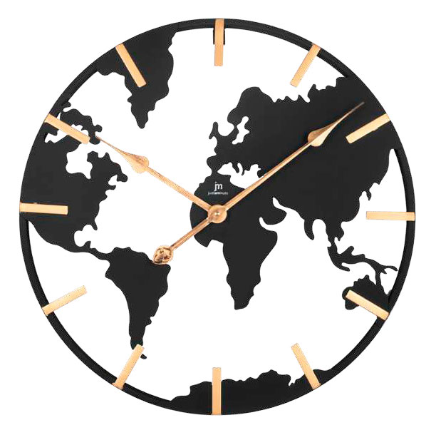 Väggklockan Justaminute 21552 har ett svartvitt färgschema mot vilket de guldfärgade visarna och linjeindexen sticker ut. En världskarta är avbildad på urtavlan. Klockan är tillverkad i metall vilket gör den mycket hållbar. Väggklockan är 50 cm i diameter. Klockan drivs på ett AA-batteri (batteri ingår ej). Justaminute-klockor har ett års garanti.