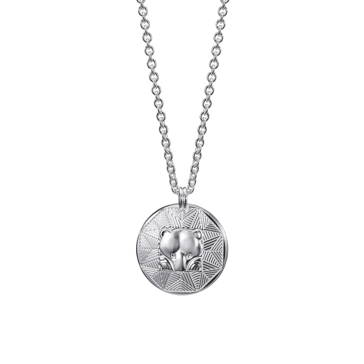Designad av Lina Simons, det stora silverhänget Bear tar dig tillbaka i tiden till de nordliga folkens forntida trosuppfattningar. Detta stora amuletthänge med en diameter på 25 mm symboliserar björnens kungaskap och visdom. Björnen har varit den nordiska skogens härskare i århundraden, och nu kan du bära med dig lite av denna uråldriga kraft. Hänget har en vacker silverfinish och kedjan har en justerbar längd på 55/60 cm.