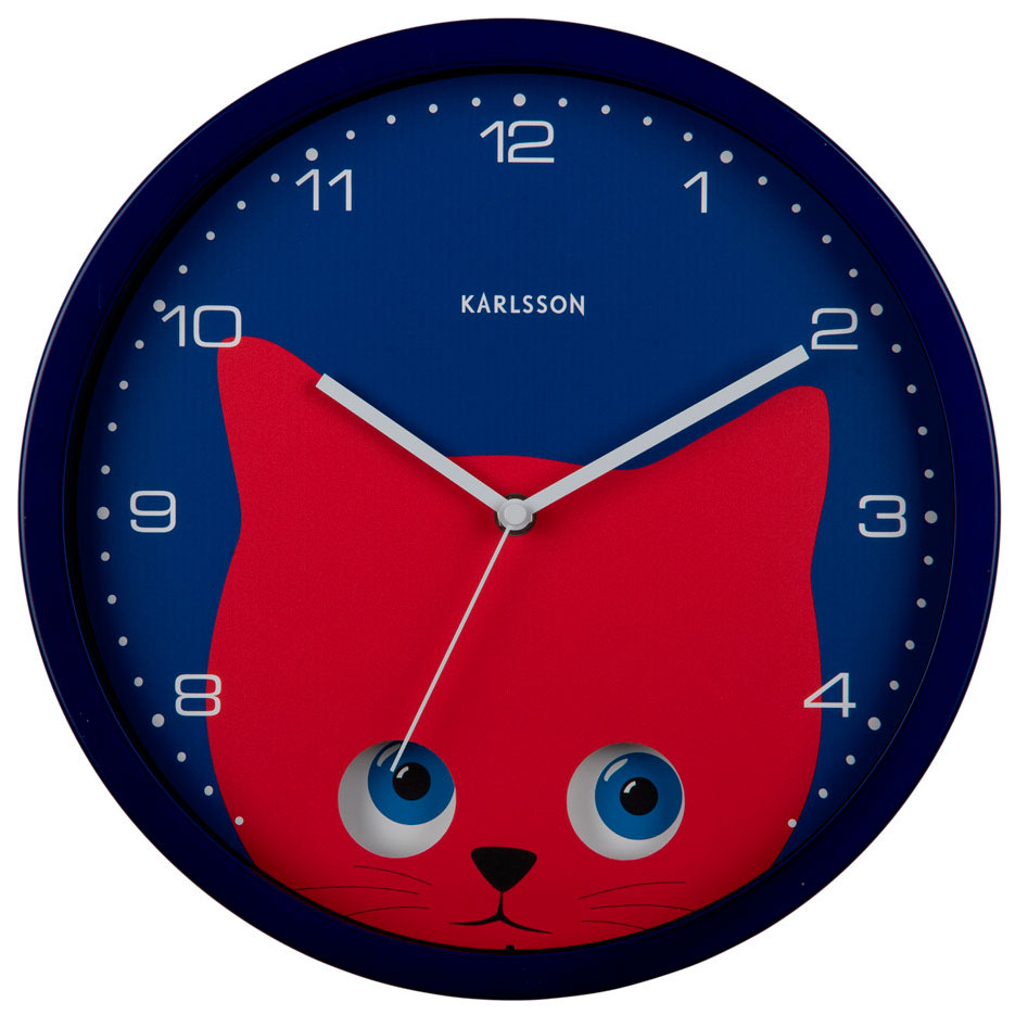 Karlsson Peekaboo Cat KA5997DB mörkblå väggklocka har en charmig röd katt med rörliga ögon, som är särskilt lämplig för att lysa upp väggen i barnrummet. Klockan har tydliga numeriska index, en minutskala och vita sekund-, minut- och timvisare. Klockan är gjord av järn och har en tyst sekund med glidande rörelse. Klockan har en diameter på 30,8 cm och en tjocklek på 4,5 cm. Klockan drivs på ett AA-batteri (batteri ingår ej). Designad av Boxtel & Buijs.