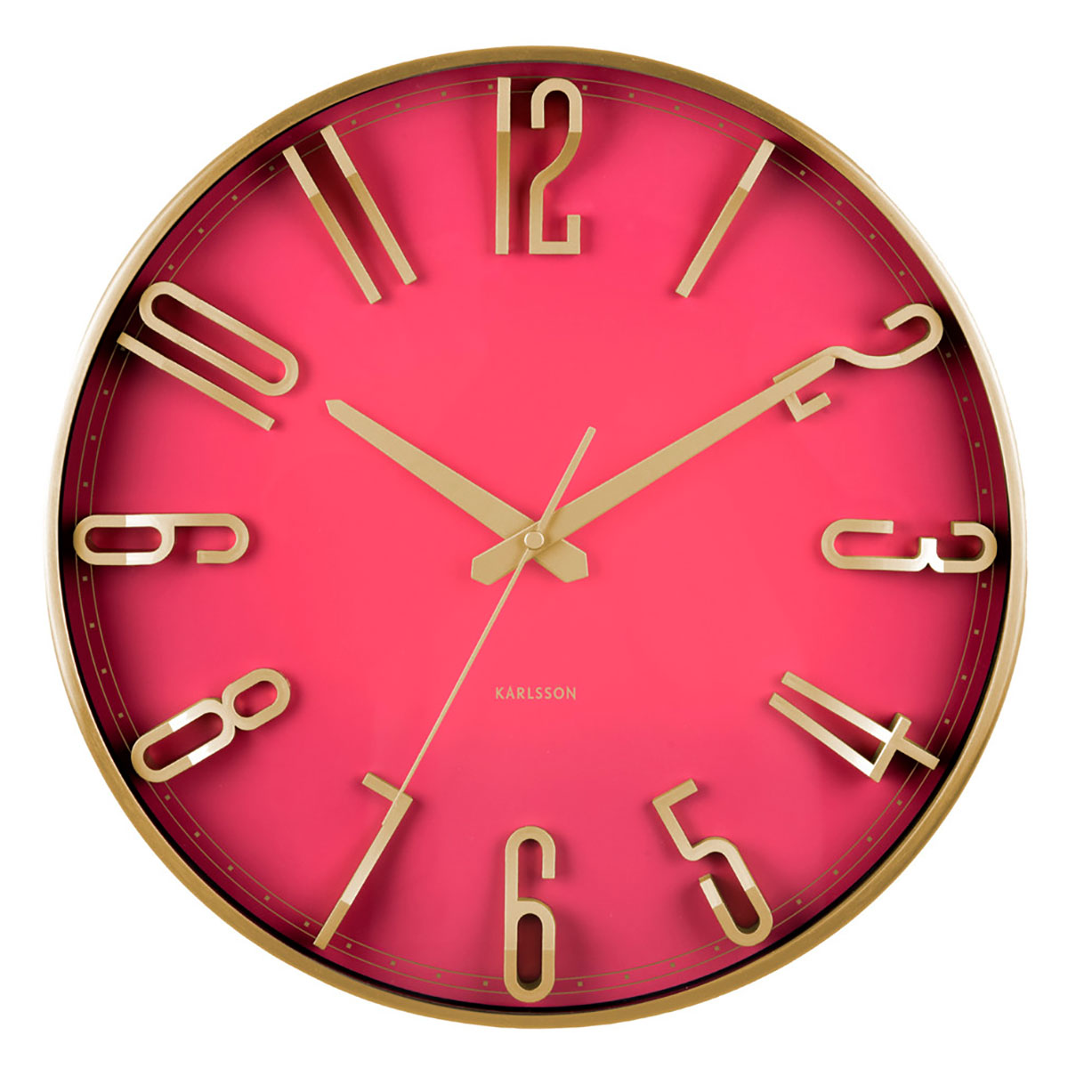 Pinkfärgad Karlsson väggklocka Elevated Glam metallic dark pink KA6016PI väggklocka har ett trendigt metalliskt skimmer, guldfärgade siffror mot en rosa urtavla och en snygg design. Väggklockan mäter 35,5 cm i diameter och 5 cm i tjocklek. Den drivs med ett AA-batteri (ingår ej).