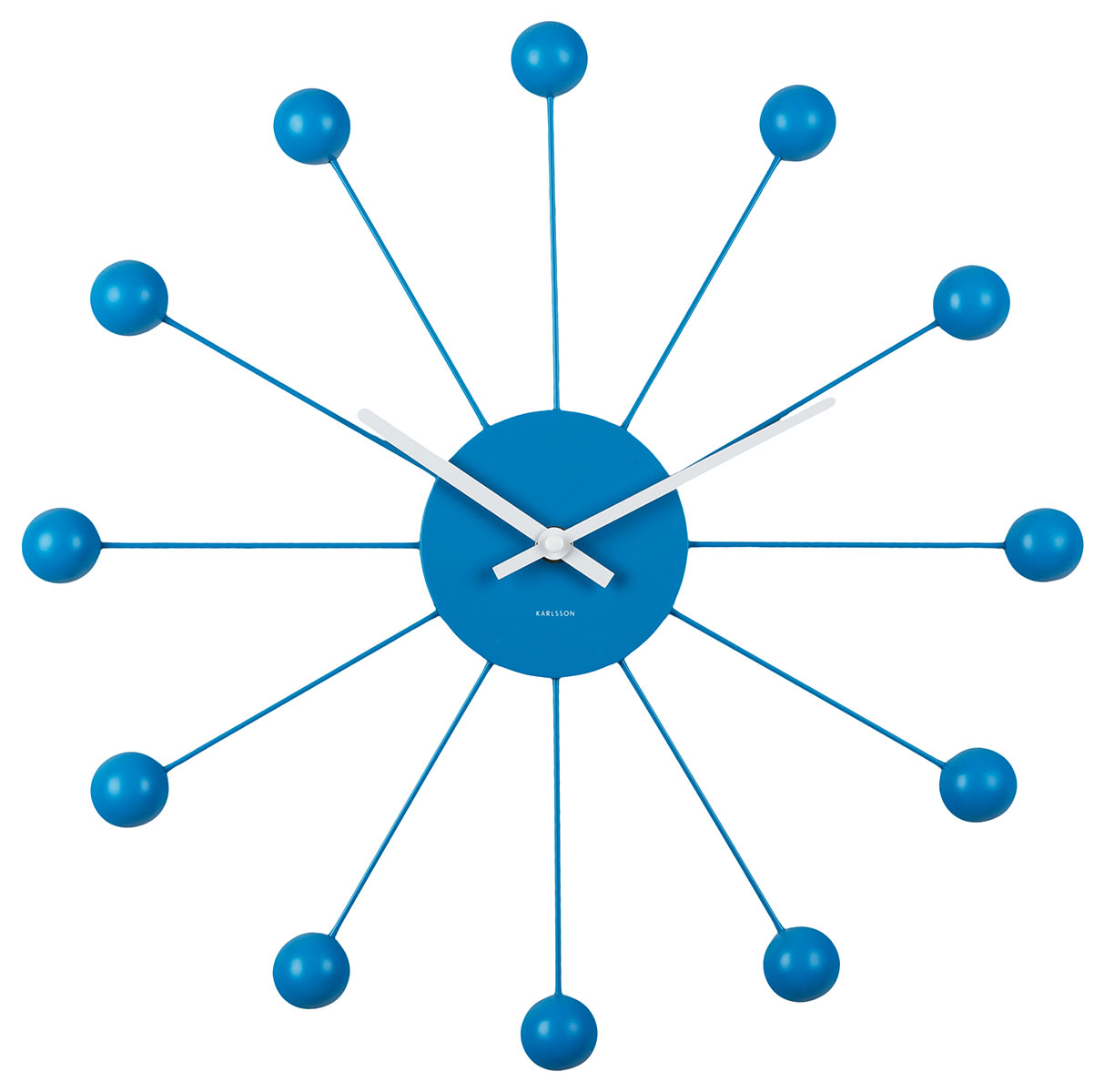 Karlsson väggklocka Funky Spider bright blue KA5977BB ljus blå väggklocka har en unik liten urtavla med tunna metallstänger och kulor som representerar index. Urtavlan har vita minut- och timvisare. Diameter 40 cm och tjocklek 4 cm. Vägguret drivs av ett AA-batteri (ingår ej). Karlsson väggklockor har två års garanti.