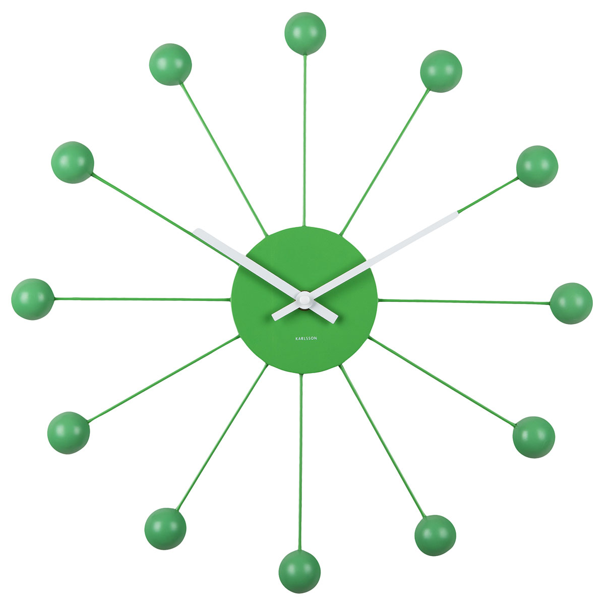 Karlsson väggklocka Funky Spider bright green KA5977BG grön väggklocka har en unik liten urtavla med tunna metallstänger och kulor som representerar index. Urtavlan har vita minut- och timvisare. Diameter 40 cm och tjocklek 4 cm. Vägguret drivs av ett AA-batteri (ingår ej). Karlsson väggklockor har två års garanti.