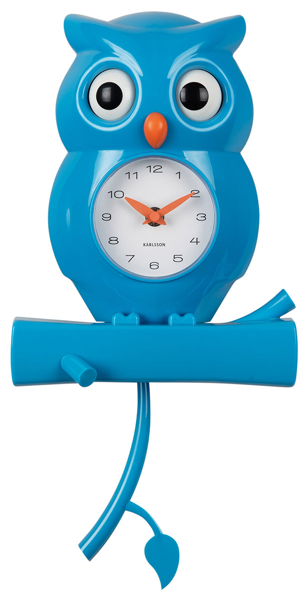 Karlsson väggklocka Owl Pendulum bright blue KA5965BB är en vacker ljusblå uggla väggklocka med pendel. Pendelns pinne och ugglans ögon rör sig fram och tillbaka i takt med klockans stadiga slag. Den vita urtavlan har numeriska index och orangefärgade minut- och timvisare. Klockan är tillverkad av ABS-plast. Höjd 37,5 cm, tjocklek 8,5 cm och bredd 20 cm. Denna charmiga väggklocka är särskilt lämplig för väggen i ett barnrum. Klockan drivs med två AA-batterier (batterier ingår ej). Karlsson väggklockor har två års garanti.