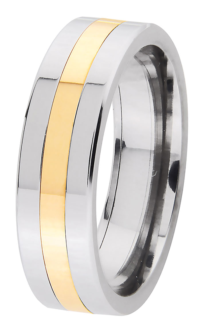 Kohinoor 006-060 ring i tålig, allergifritt titan med 14K guldplätering. Bredd 5 mm. Kohinoor smycken tillverkas i Tavastehus, Finland.