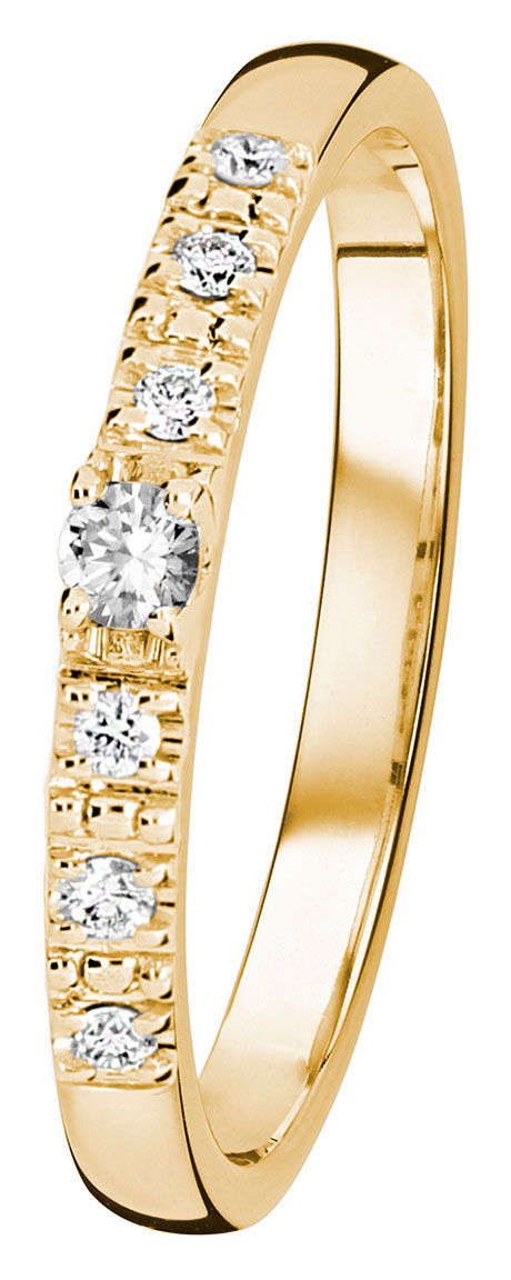 Kohinoor 033-226-10 Estelle är en fin sidostensring i 14K guld med en större diamant och sex stenar runtom sig. Bredd 2,1 mm. Kohinoor smycken tillverkas i Tavastehus, Finland.