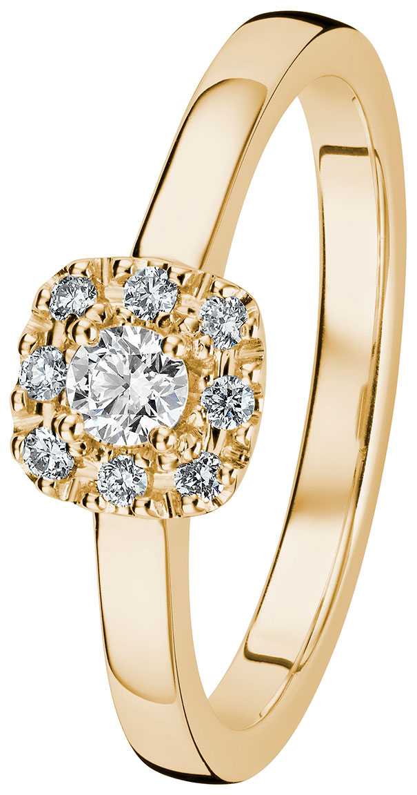 Kohinoor 033-263-17 Valerie haloring i gulguld med en 0,09 ct diamant och åtta mindre 0,01 ct stenar runtom sig. Kohinoor smycken tillverkas i Tavastehus, Finland.
