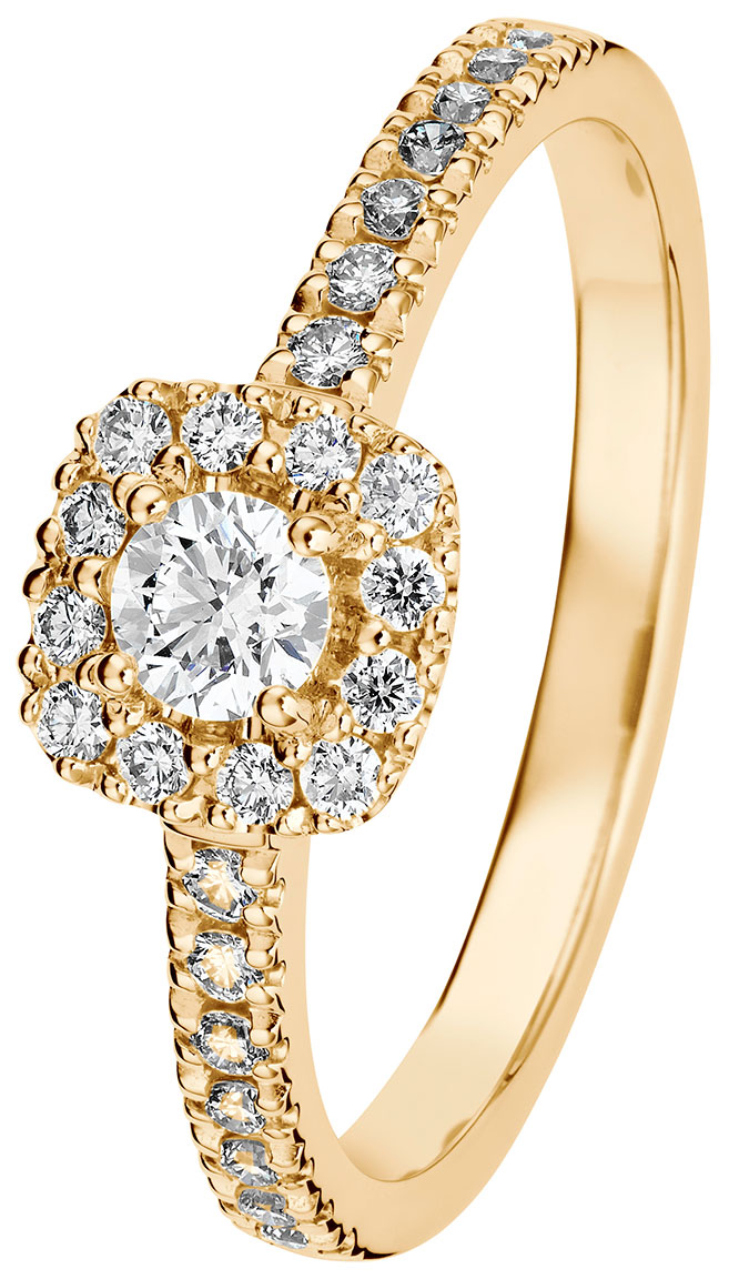 Kohinoor 033-263-44 Valerie haloring i gulguld med en 0,18 ct diamant och tolv mindre 0,01 ct stenar runtom sig och en rad av 7 små 0,01 ct diamanter i skenan på vardera sida. Kohinoor smycken tillverkas i Tavastehus, Finland.