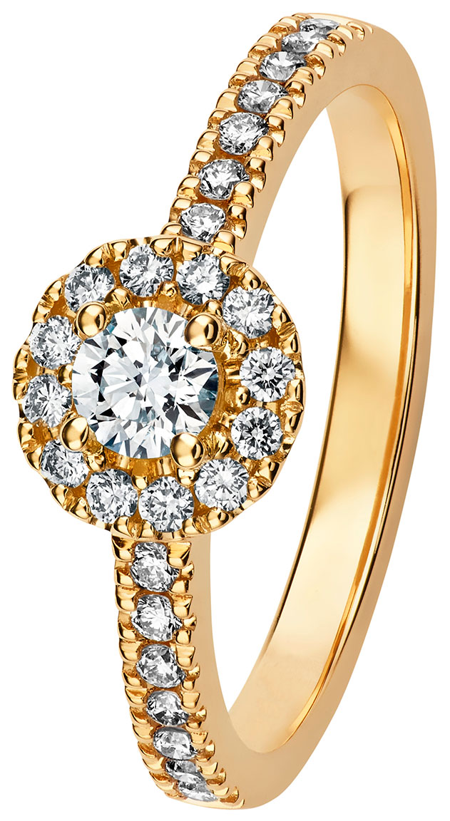 Kohinoor 033-264-44 Valerie haloring i gulguld med en 0,18 ct diamant och tolv mindre 0,01 ct stenar runtom sig och en rad av 7 små 0,01 ct diamanter i skenan på vardera sida. Kohinoor smycken tillverkas i Tavastehus, Finland.