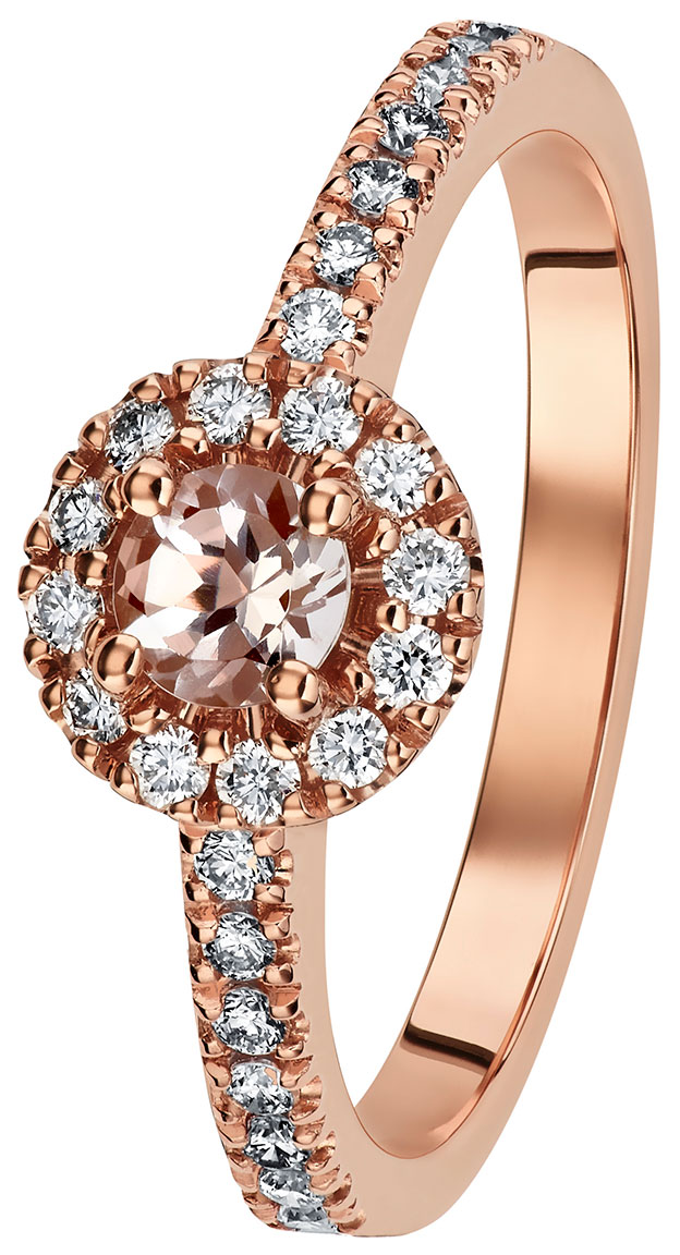 Kohinoor 033-264P-26MO Valerie haloring i ròseguld med en ljusröd morganit och tolv mindre 0,01 ct stenar runtom sig och en rad av 7 små 0,01 ct diamanter i skenan på vardera sida. Kohinoor smycken tillverkas i Tavastehus, Finland.