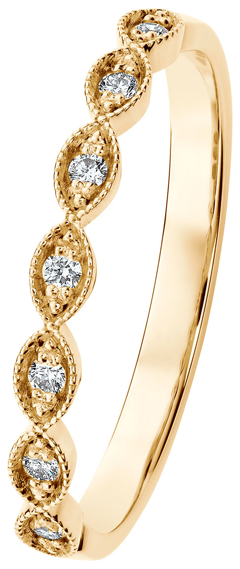 14 karat guldring Kohinoor 033-269-07 Clara har fått inspiration av spets och har 7 briljantslipade diamanter. Tjockleken är 2 mm. Kohinoor smycken tillverkas i Tavastehus, Finland.