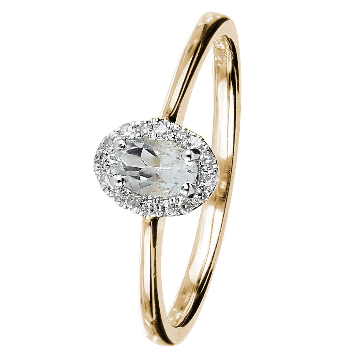 Elegant halo diamantring i 14 karat gult guld med en grön ametist som mittsten. Ametisten är inramad av 16 briljantslipade Wesselton-diamanter av SI-kvalitet (0,003 ct vardera) som väger 0,05 ct. Ringens bredd vid stenarna är 7 mm och skaftets bredd är 1,5 mm. Ett klassiskt och tidlöst val för speciella tillfällen.