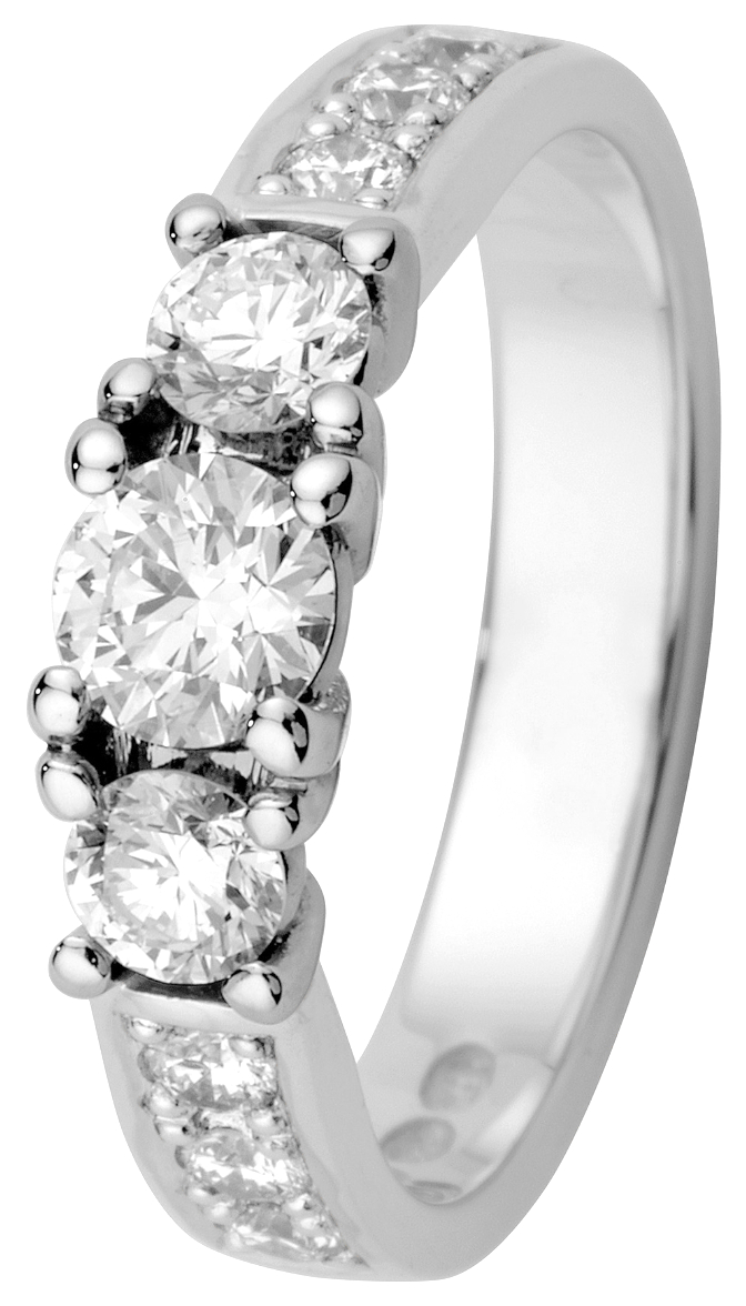 Kohinoor Margit diamantring i vitguld 933-210V-100B4 är en vacker sidostensring i vitguld, prydd med tre kroninfattade mittdiamanter och flankerad av mindre stenar. Skenan med raka linjer sitter bekvämt på fingret. Kohinoors diamantringar är tillverkade i Finland och levereras i tillverkarens originalförpackning.