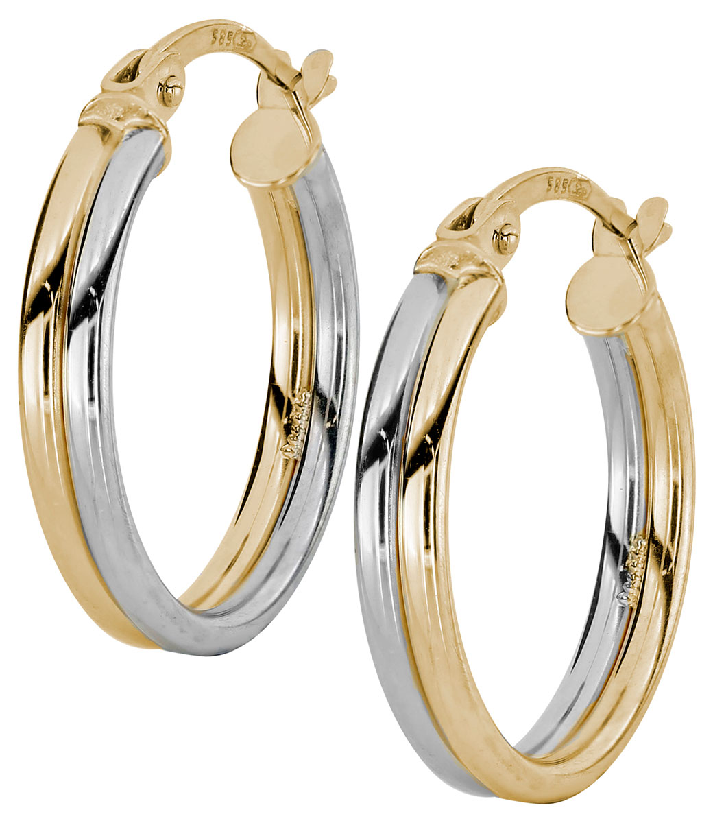 Kohinoor tvåfärgade tubcreoler 133-8443 är nätta och eleganta örhängen tillverkade i 14k gult och vitt guld, perfekta för vardagsbruk. Örhängenas diameter är 15 mm. Storlek 3 x 1,5 mm. Örhängena har ett gångjärnsfäste. Finska Kohinoor örhängen levereras i tillverkarens originalask.