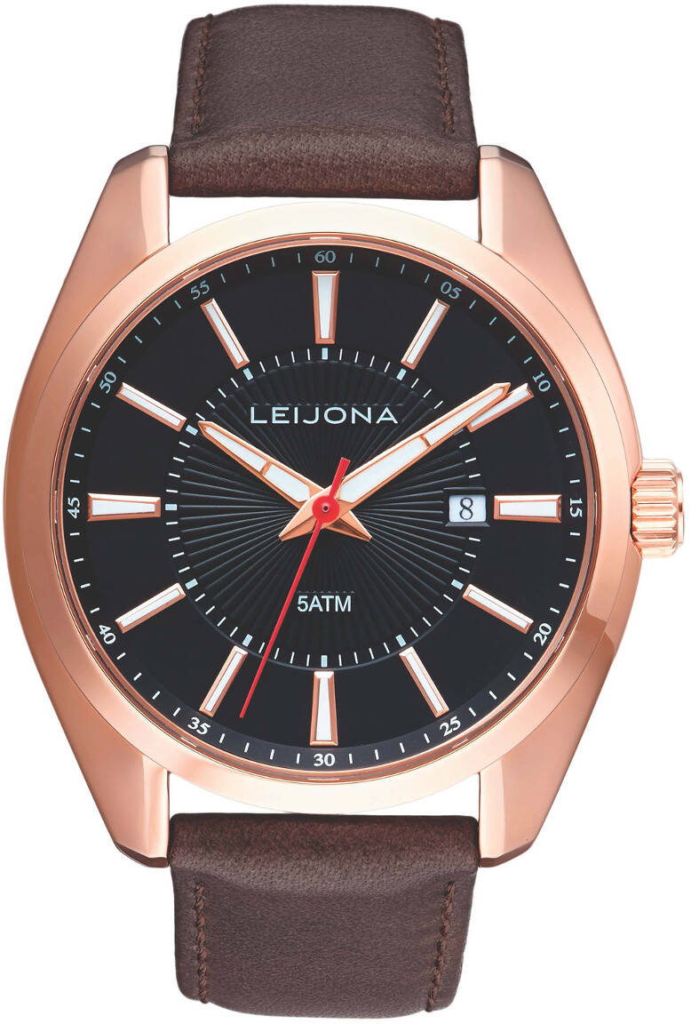 Leijona 5020-2421 är en snygg herrklocka som passar til det mesta. Boettens bredd är 42 mm och den är tillverkad i rostfritt stål. Det bruna läderarmbandet gör klockan extra snygg. Armbandets bredd är 20 mm. Klockan visar datum.