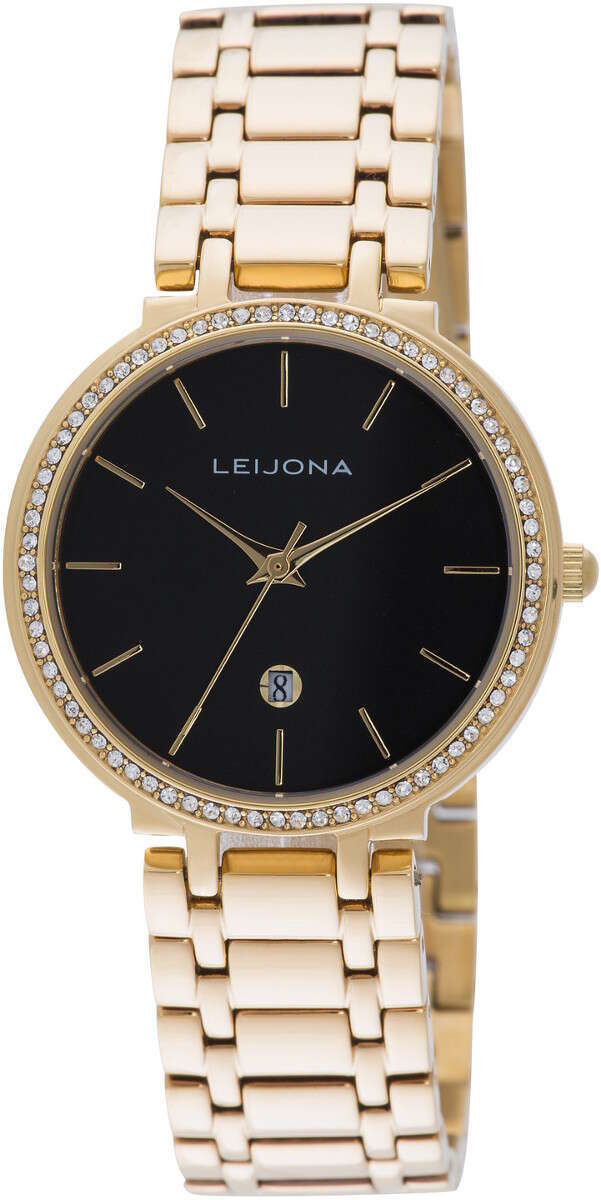 Helt guldfrägad Leijona Hoods Malmi 5170-4081 med minimalistisk utseende passar både till vardag och fest. Denna elegant damklocka har en svart urtavla och bezellen är prydd med vita kristaller. Boetten är 33 mm i diameter och datum sitter vid klockan 6. Finska designade Leijona klockor har 2 års garanti.