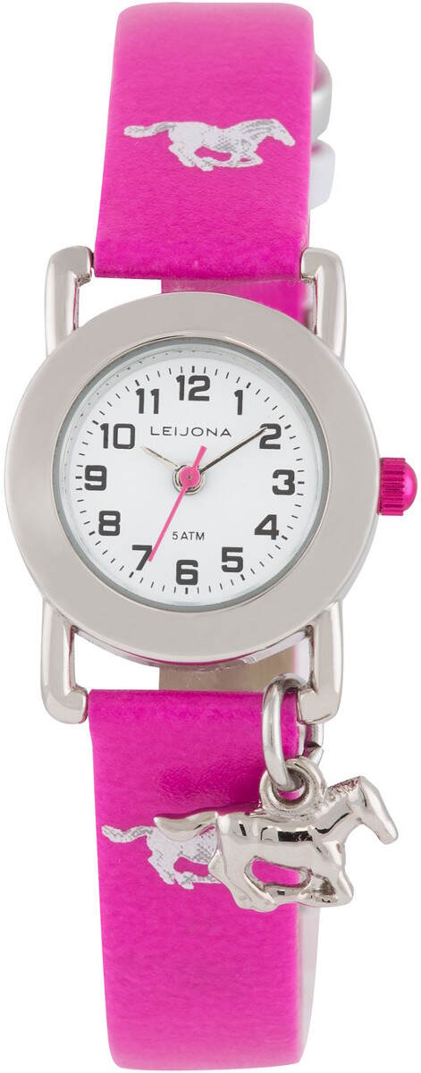 Pink Leijona 5323-784 barnklocka. Klockan har ett hästberlock på armbandet. Armbandet är 13 mm brett och tillverkat av konstläder. Kroppen är 22 mm bred och 8 mm tjock. Finska designad Leijona-klockorna har 2 års garanti och levereras i tillverkarens originalförpackning.