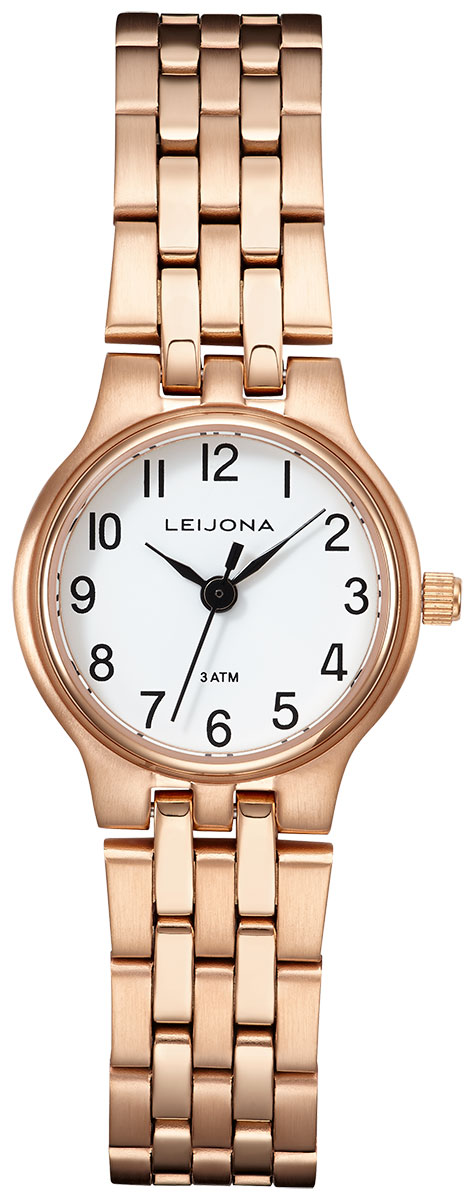 Damklockan Leijona Classic Pilpasuo 5170-2750 har ett Miyota GL32 kvartsurverk. Klockans roseguldfärgade boett och armband i rostfritt stål är bara 23 mm breda och 7 mm tjocka. Slitstarkt mineralglas skyddar urtavlan, vars svarta numeriska index sticker ut tydligt mot den vita urtavlan. Leijona Classic Pilpasuo 5170-2750 har en vattentäthetsklass på 30 m / 3 atm, vilket innebär att den är stänksäker.