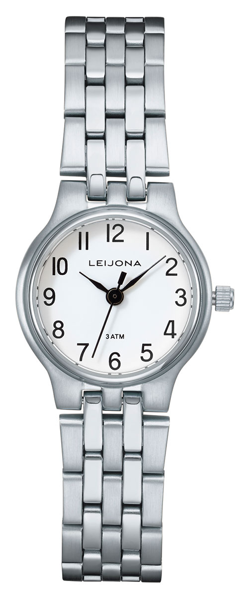 Damklockan Leijona Classic Pilpasuo 5172-2757 har ett Miyota GL32 kvartsurverk. Klockan har en silverfärgad boett och armband i rostfritt stål som bara mäter 23 mm i bredd och 7 mm i tjocklek. Hållbart mineralglas skyddar urtavlan, vars svarta numeriska index står ut tydligt mot den vita boett. Leijona Classic Pilpasuo 5172-2757 är vattenresistent till 30 m/3 atm, vilket gör den stänksäker.