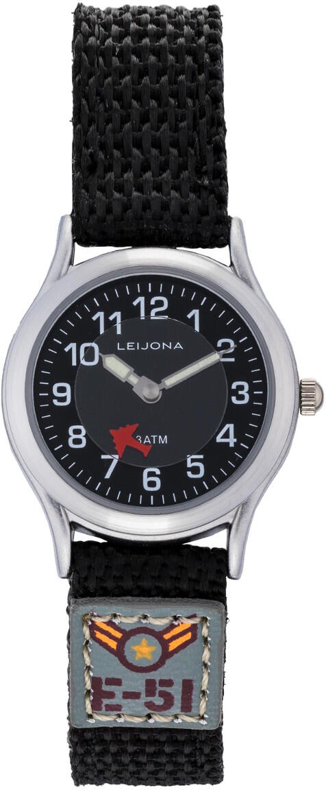 Leijona Kids Black 5223-231 barn klocka med en tydlig, svart urtavla och en 27 mm boett i rostfritt stål. Den här enkel analog klocka har en flygplan på urtavlan och boetten är matchad med ett nylon rem. Finska designade Leijona klockor har 2 års garanti.
