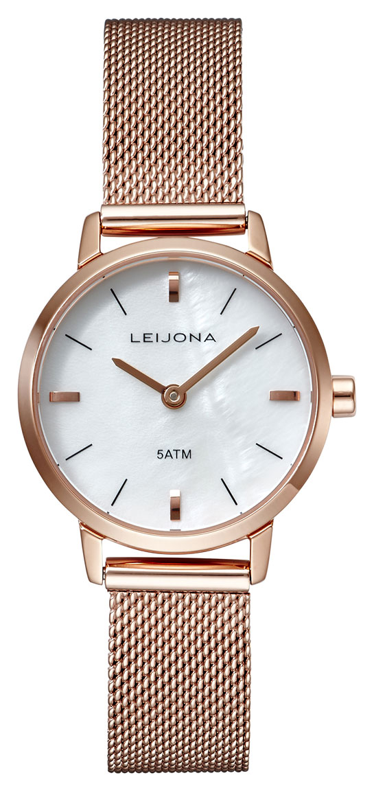 Leijona Hoods Eira Rose Gold 5170-4589 är en klassisk damklocka med roseguldfärgat hölje, mesh armband och en fin pärlemor urtavla. Boetten bredd är 26 mm och tjocklek är 6,8 mm. Leijona-klockor har 2 års garanti, och skickas hem i tillverkarens originalförpackning.