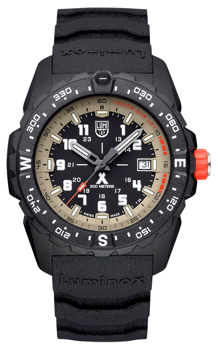 Luminox Bear Grylls Mountain 3731 armbandsur har en ultralätt CARBONOX™-ram och en vridbar sol kompass bezel. Urtavlan har tåligt safirglas med antireflexbehandling och självlysande index och visare för bättre läsbarhet. Baksidan av boetten är graverad med Bear Grylls signatur och hans berömda motto "Never Give Up" på kanten av urtavlan.