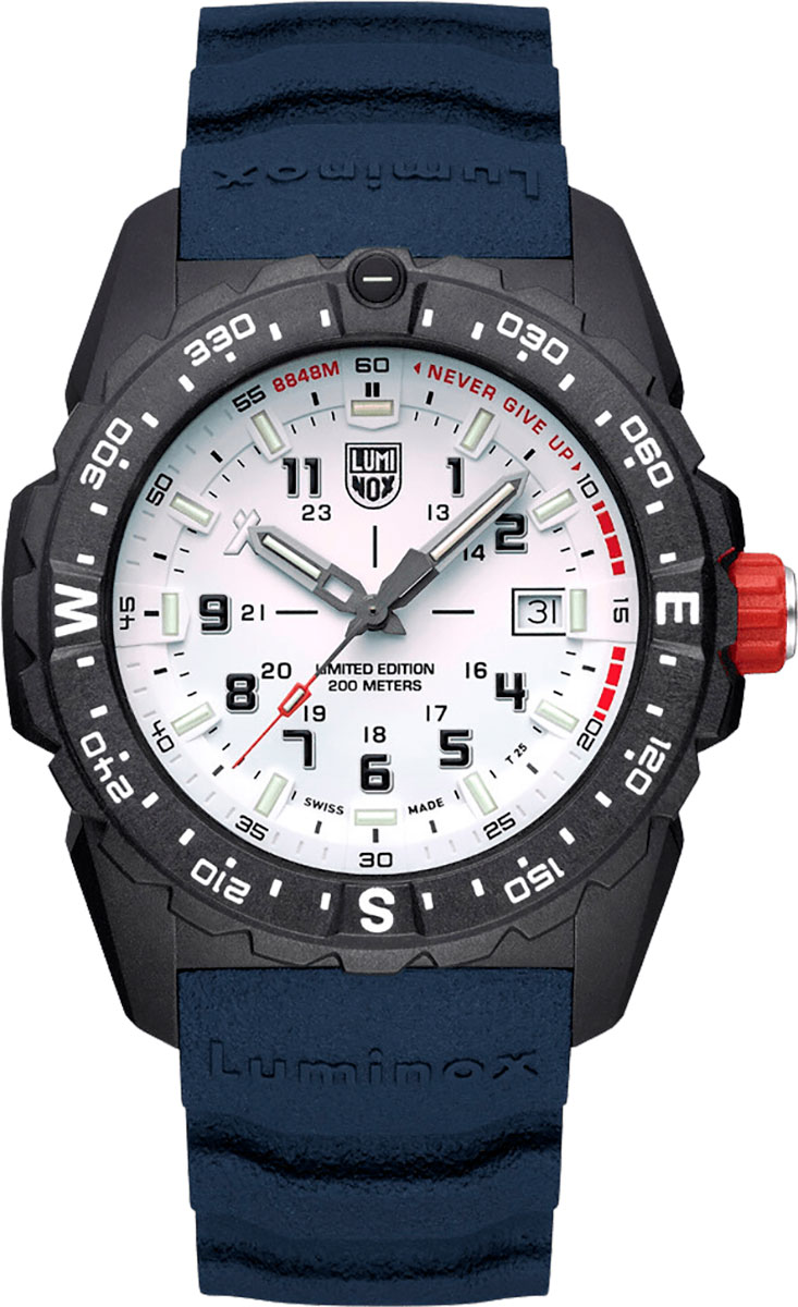 Luminox Bear Grylls Mountain 3737 Limited Edition är en begränsad utgåva som firar 25-årsjubileet av Bear Grylls episka bedrift att bestiga världens högsta berg, Mount Everest. Denna specialklocka är begränsad till 800 exemplar världen över och har en markant vit urtavla, djupblått armband och en röd krona som matchar färgerna på Nepals flagga, där Mount Everest ligger. Baksidan av boetten är dekorerad med en bild av Mount Everest och den yttre ringen bär inskriptionen "8848M" - Mount Everests höjd. Klockan har en ultralätt boett i CARBONOX™ och en vridbar bezel. Urtavlan med självlysande index och visare för bättre läsbarhet täckts av ett tåligt safirglas med antireflexbehandling.