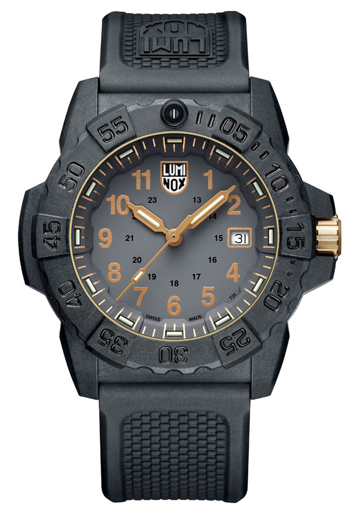 Luminox Navy SEAL 3508.GOLD är ett tålig dykarklocka för alla utomhusaktiviteter. Tillverkad av carbonfiber förstärkt CARBONOX™-material, denna äventyrsklocka är 6 gånger tunnare än stål, antimagnetisk och hypoallergisk. Bakboett är i 316L kirurgisk stål. Denna dykarklockan är rustad med en vridbar bezel, datumvisning och självlysande tidsmarkörer (Luminox Light Technology (LLT). Index och visare är självlysande upp till 25 år. Klockan är vattentät ned till 200 meter, och passar utmärkt för tubdykning och vattensporter. Urtavla är skyddad med en mineralglas. Boetten mäter 45 mm i diameter och är välbalanserad. På insidan tickar ett Swiss Quartz Ronda 515 urverket. Luminox Navy SEAL 3508.GOLD har garanti upp till två år.
