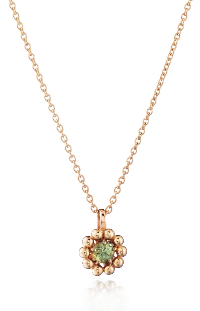 Smyckesserien Lumoava Daisy är inspirerat av sommaren och pryds av ett vackert blomhänge. Lumoava Daisy safir guldhalsband L76248133000 är i gult guld och hänget mäter 8 x 10 mm i diameter. Blomhalsbandet är smyckace med en grön safir som är 3,5 mm i diameter. Kedjans längd är 45 cm. Designad av Heikki Hartikainen. Lumoava-smycken är handgjorda i Finland.