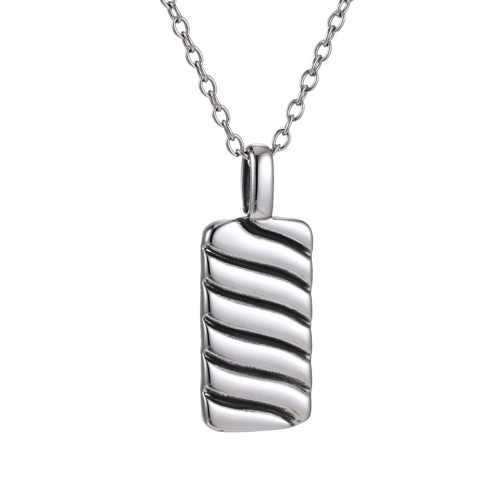 Lykka Strong brickhänge halsband är ett stilrent och modernt smycke tillverkat av hållbart rostfritt stål. Hänget är rektangulärt och pryds av en vågformad, tredimensionell struktur som ger en levande och intressant yta.