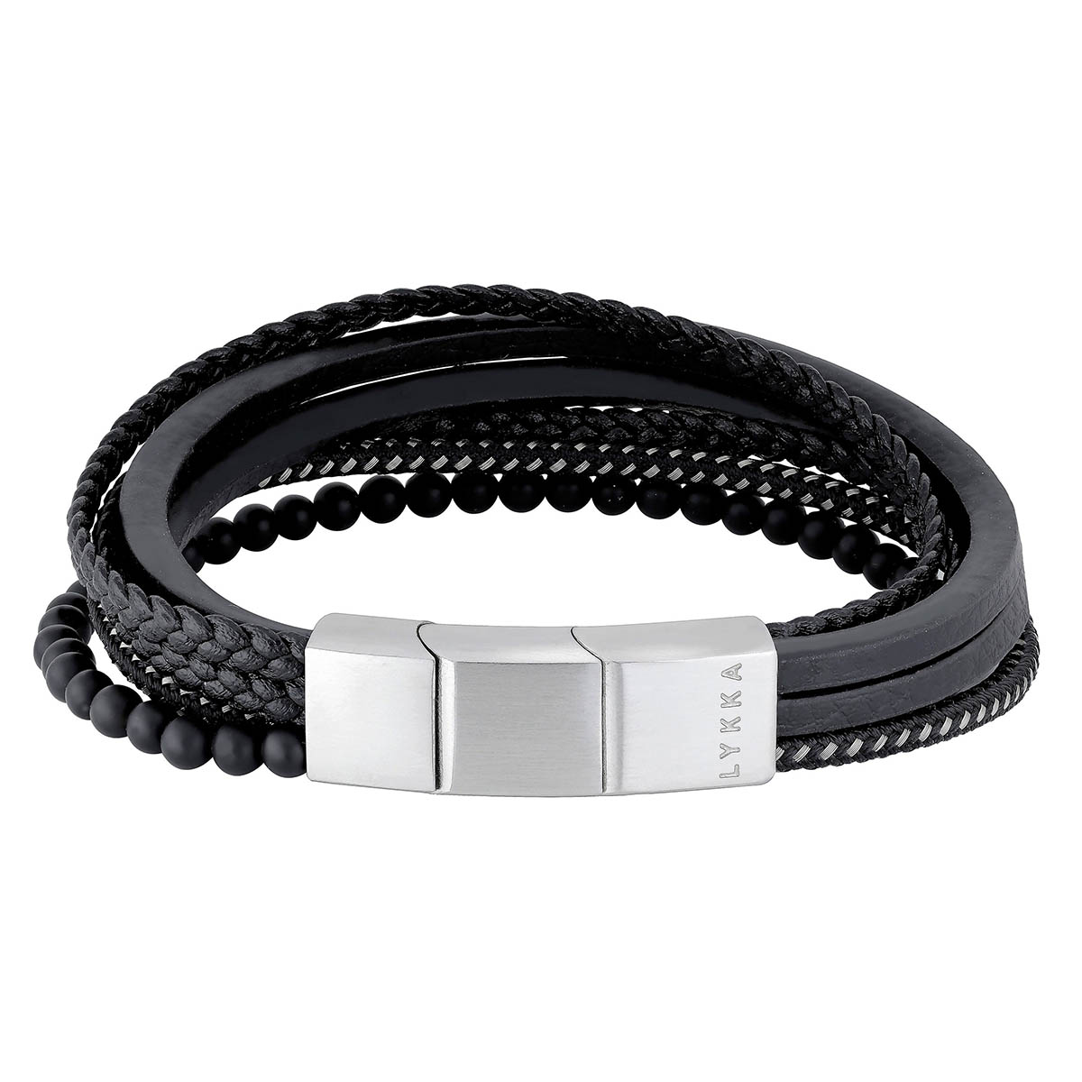 Lykka Strong svarta läderarmbandet är ett flerskiktat och iögonfallande herrarmband som elegant kombinerar svart läder och rostfritt stål. Armbandet har flera olika stilar av remmar, såsom flätat läder, slätt läderarmband och matta ädelstenar, vilket skapar en modern och personlig look.