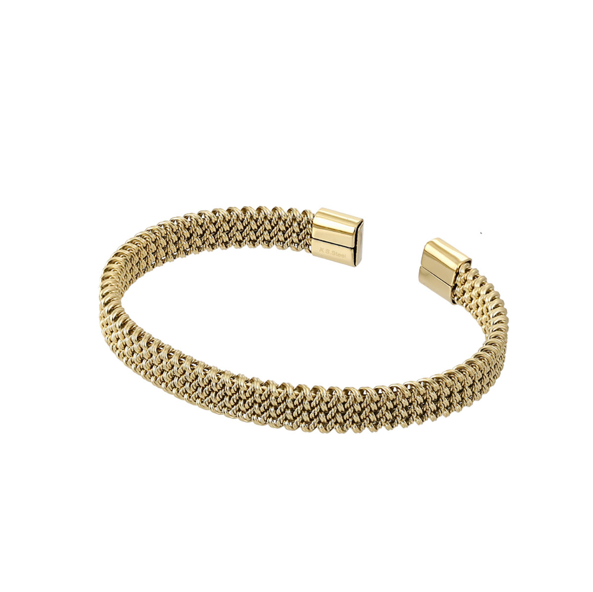 Det stiliga och robusta guldiga Lykka Trend armbandet är gjort av rostfritt stål och ger din klädsel en elegant och modern känsla. Armbandet är tillverkat av en tät fläta som skapar en iögonfallande och livfull yta. Den flexibla öppna modellen är lätt att ta på utan lås. De glänsande änddelarna fulländar smyckets moderna utseende. Lykka Trend armband är tillverkat av rostfritt stål. Smycket är guldigt och har ett mesh-mönster. Smyckets diameter är 60 mm och tjockleken är 8 mm.