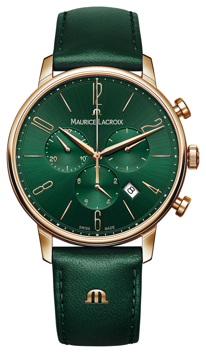 Maurice Lacroix Eliros EL1098-PVP01-620-5 är en tidlös accessoar för herrar. Denna schweizisk herrklocka har en guldfärgat boett på 40 mm som är matchad med ett grönt läderarmband. Den grön sunburst urtavlan har tre undertavlor för tidtagning, klassiska "arrow" händer och en datumvisning. På insidan fanns ett kvartsverk. Schweiziska Maurice Lacroix klockor har 2 års garanti och skickas hem i tillverkarens originalförpackning.