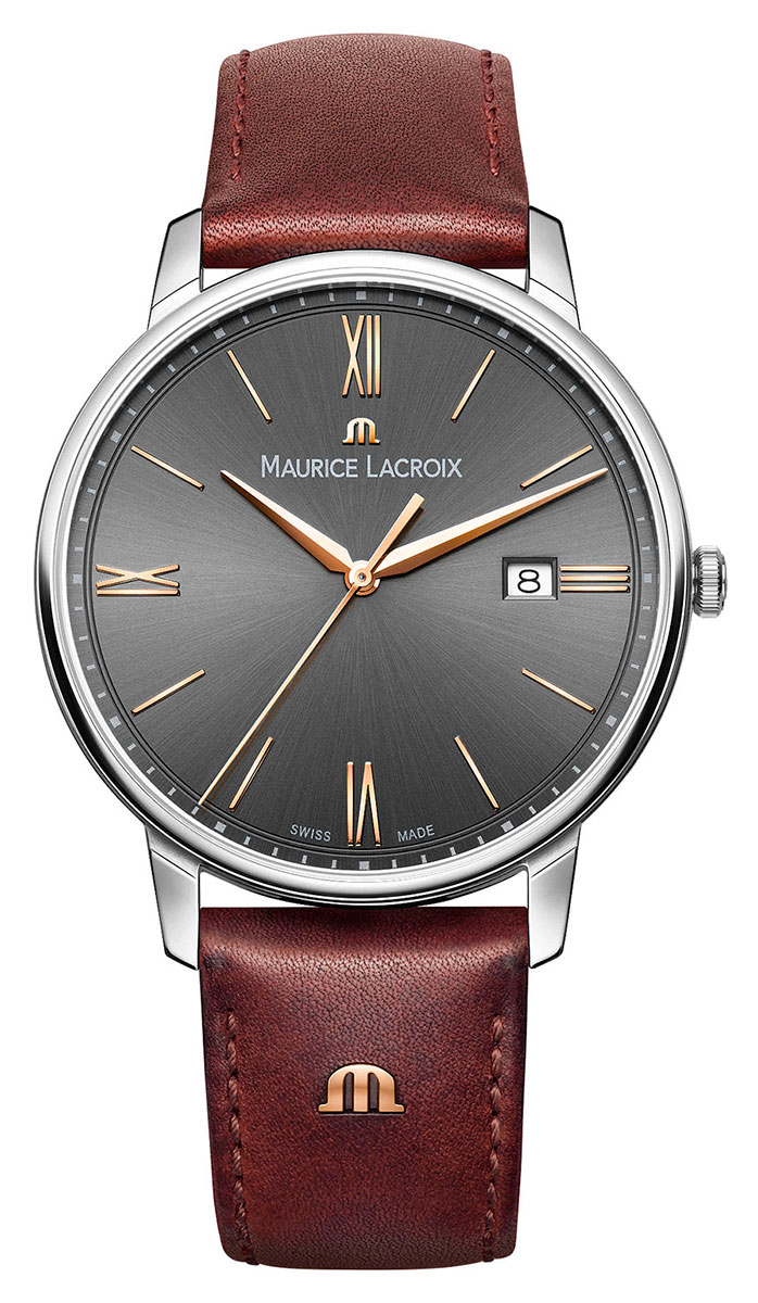 Maurice Lacroix Eliros EL1118-SS001-311-1 är en snygg herrklocka med en 40 mm bred och 8 mm tjock silverfärgad boett i rostfritt stål. Boetten är försedd med ett brunt läderarmband med Lacroix-logotyp och en bredd på 20 mm vid fästpunkten. Under safirglaset skyddas en grå urtavla med datum vid klockan 3. Maurice Lacroix Eliros EL1118-SS001-311-1 har en vattentålighetsklass på 50m/5atm, vilket innebär att den har begränsad vattentålighet (simning rekommenderas inte).