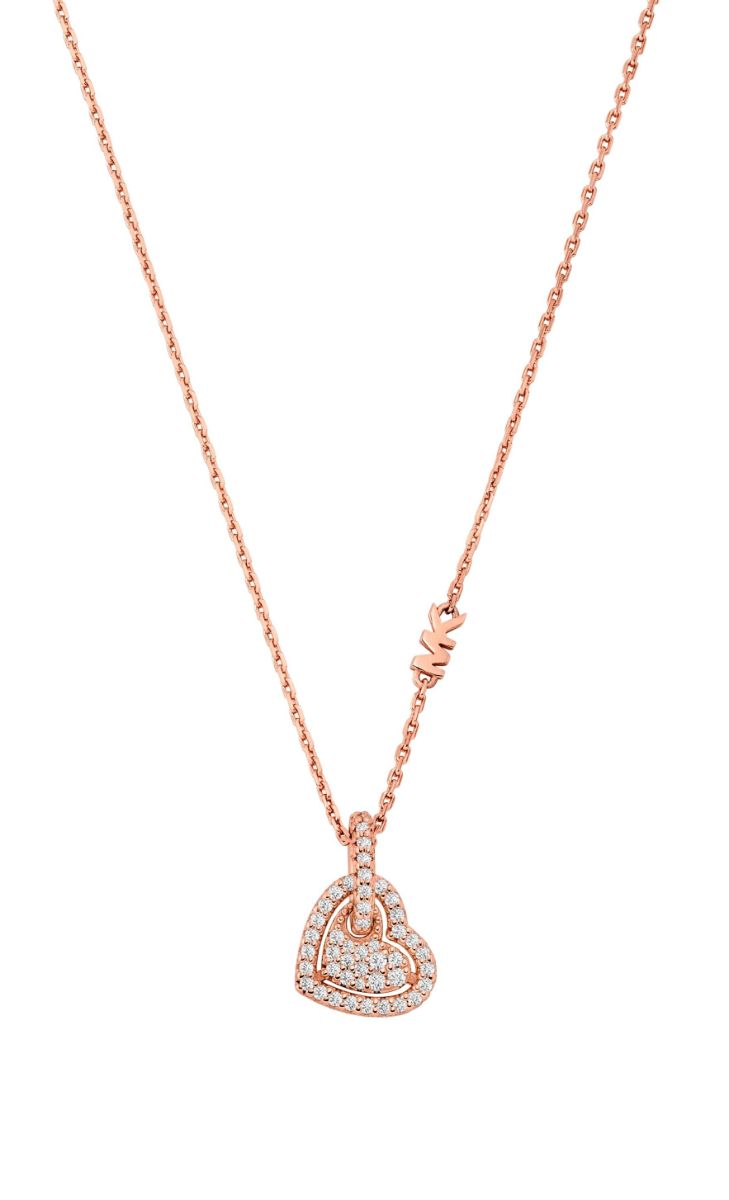 Michael Kors Love roséguldpläterat silverhjärthalsband MKC1747CZ791 är en lyxig accessoar från toppdesignern Michael Kors. Hjärthalsbandet är tillverkat av 14 karat roséguldpläterat sterlingsilver och hänget är utsmyckat med en pavè-infattning, med briljantslipade kubiska kubiska zirkonia stenar som avslutar smyckets hela yta. Hjärthänget mäter 12,5 mm och kedjans längd är justerbar mellan 45 och 50 cm. Michael Kors Love roséguldfärgat silverhjärthalsband MKC1747CZ791 levereras i tillverkarens originalförpackning.