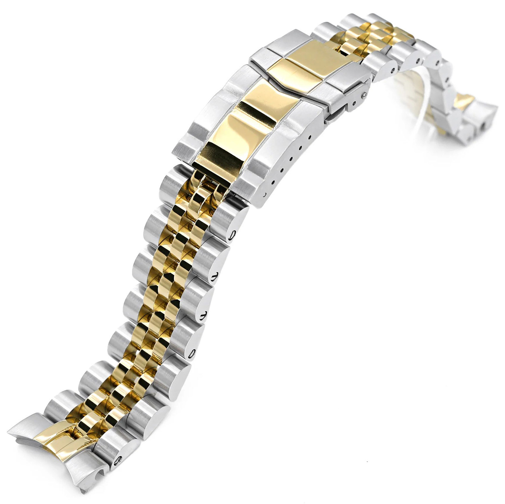 Tvåfrägat MiLTAT Angus-J Louis Seiko Alpinist serie SS201805P2G064 klockarmband är tillverkat av 316L rostfritt stål med en guldfärgad mitten. Armbandet är lämpligt för Seiko Automatic Alpinist-klockor. Armbandets delar är skruvfasta. Levereras med 2 st. 2 mm fjäderstift för att säkerställa säker montering i klockboetten. Armbandets bredd i ändarna är 20 mm och längden är lätt att justera tack vare de sex justeringshålen i låset. Ett dubbellåsande spänne säkerställer en stabil låsning. MiLTAT-armband garanteras i ett år.