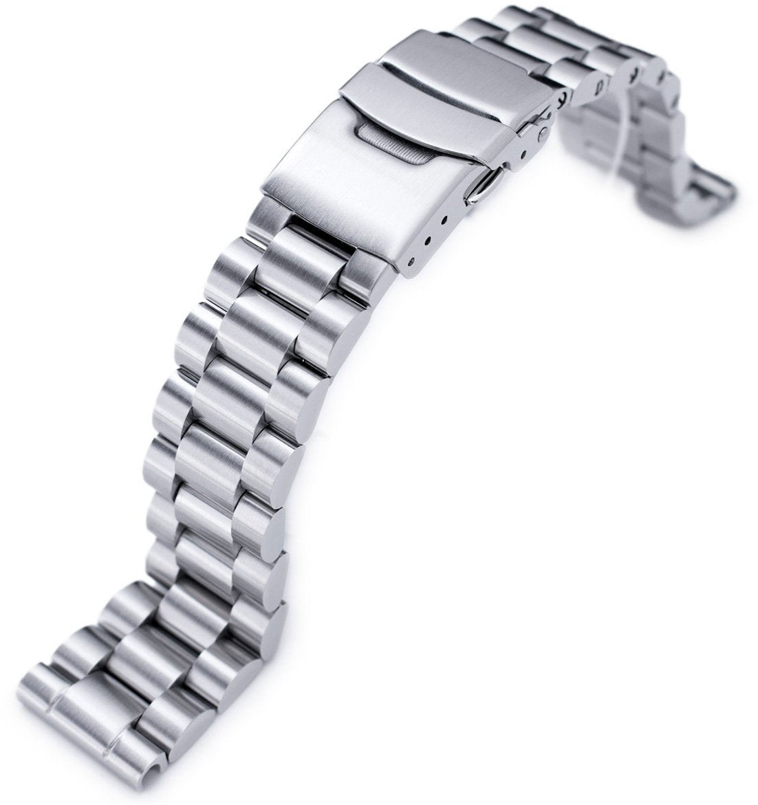 MiLTAT Super-O Boyer Stainless Steel Strap for Seiko 5 SS221805P2S019-S5 är tillverkat av 316L kirurgiskt stål. Armbandet passar till Seiko-klockor (SRPD51, SRPD53, SRPD55, SRPD57, SRPD59, SRPD61, SRPD63, SRPD65, SRPD67, SRPD69, SRPD71, SRPD73, SRPD75, SRPD76, SRPD77, SRPD79, SRPD81, SRPD83 och SRPD85). Längden på armbandet kan enkelt justeras tack vare de sex justeringshålen på spännet. Armbandet levereras med 2 st. 2 mm fjäderpinnar för säker montering i boetten. Armbandet är 22 mm brett vid lug och armbandsdelarna är fastskruvade. En dubbel låsande säkerhetsläs kompletterar armbandet.