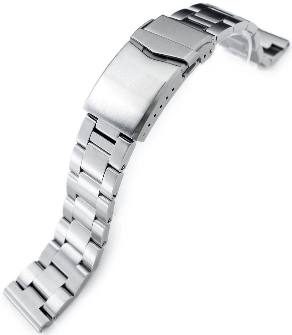 MiLTAT Super Oyster 20mm Straight End stålarmband SS201820B032S. Armbandet är tillverkat av 316L rostfritt stål och passar alla klockor med standard 20mm lugbredd. Armbandsdelarna är fastskruvade och avrundade i hörnen. Levereras med 2 st 2,5 mm fjäderpinnar för säker fastsättning i klockhuset. Bredden på armbandet är 20 mm vid ändarna och 18 mm vid låset. MiLTAT-armbanden garanteras i ett år.