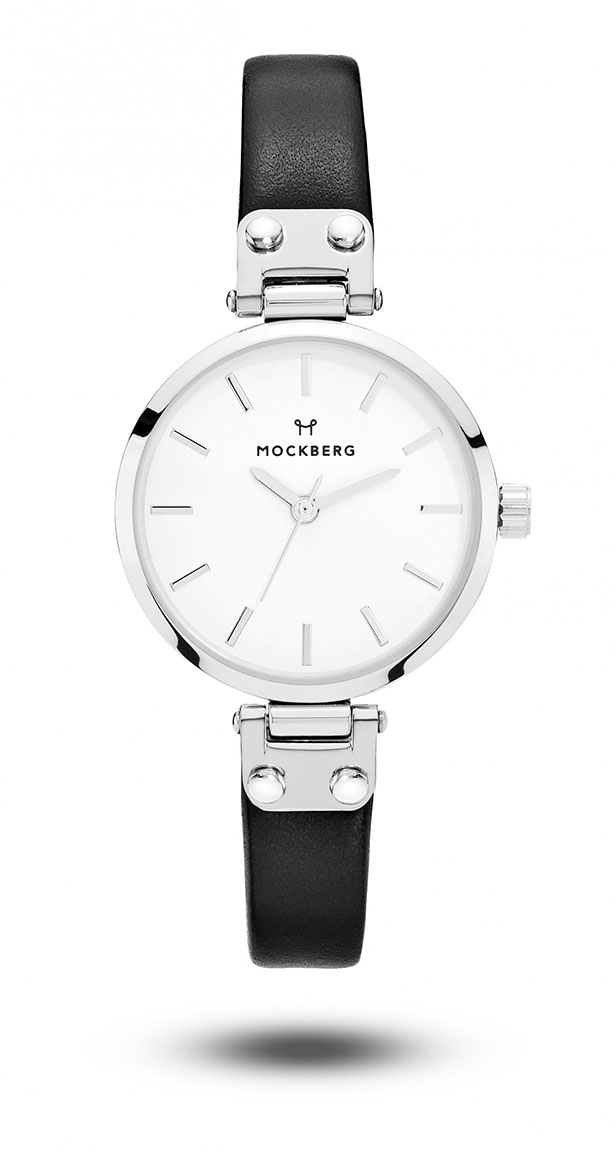 Mockberg Astrid Petite MO202 är en nättare klocka. Klockan har en silverplätering och armbandet är tillverkat av svart läder. Urtavlan är vit. Boettens bredd är 28 mm och tjockleken är 7,2 mm. Armbandets bredd är 13 mm. Denna kvartsklockan har ett japanskt Miyota Super 2035 urverk. Vi erbjuder garanti upp till två år och din klocka skickas hem i originalboxen.