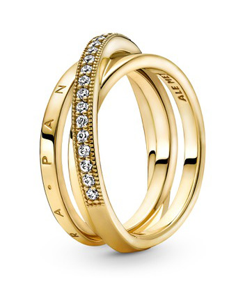 Pandora Crossover Pavé Triple Band ring 169057C01 kryssring i 14k-guld pläterad sterling silver med vita kubisk zirkonia stenar. Pandora smycken skickas hem i tillverkarens originalförpackning.
