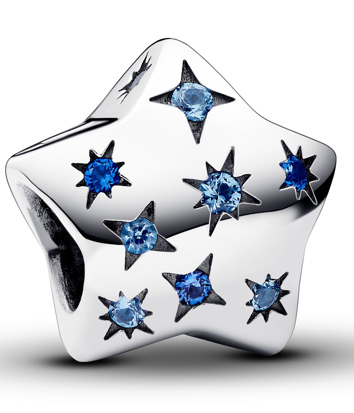 Pandora Moments Bold Sparkling Star Sterling silver Blå kristall 792974C01 stjärnsmycke är ett fint tillskott till dina Pandora-smycken. Det är utsmyckat med en mängd stjärnor som blinkar vackert som natthimlen. Själva smycket är i sterlingsilver och stenarna är briljantslipade syntetiska zirkonia.